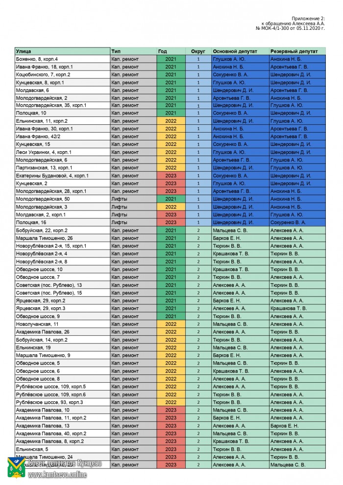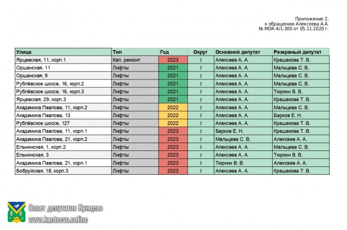 - Определить закрепление депутатов Совета депутатов муниципального округа Кунцево для участия в работе комиссий, осуществляющих открытие работ и приемку оказанных услуг и (или) выполненных работ по капитальному ремонту инженерных систем, конструктивных элементов и замене лифтового оборудования (приложения