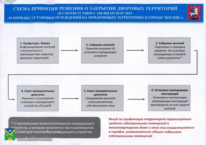 - В муниципальный совет депутатов подаются соответствующее заявление, протокол собрания жильцов-собственников и техническая документация, то есть проект ограждения. Совет принимает решение не дольше месяца (это отдельно законодательно оговорено) и о своем решении уведомляет того, кто подал заявление, не позже, чем через пять дней после вынесения вердикта.