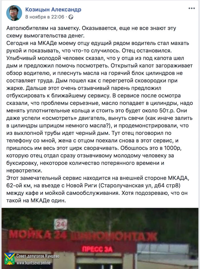 О мошеннических действиях с ремонтом автомобилей в Рублёво Реквизиты обращения Рег. номер: МОК-4/1-246 Ведомство \ организация: Начальнику отдела МВД по р-ну Кунцево Дата отправки: 20.06.2019 Статус ответа: Ответ получен Обращение: 2019-06-20-246-o-moshennicheskih-deistvijah-s-remontom-avtomobilei-v-rublyovo-1.pdf | Скачать | 125 Кб Ответ: 028november.pdf | Скачать | 1 Мб проишествия 20.06.2019 10:28 2293 Алексеев Алексей 2 комментария RSS Написать комментарий Алексеев Алексей 12.11.2019 20:00 # ↓ Вот тут схожая www.facebook.com/photo.php?fbid=1464229277062076&set=a.888627561288920&type=3 Скриншот Ответить Алексеев Алексей 26.11.2019 19:37 # ↓ Ответить Ваше имя: E-mail для ответов: Загрузка...