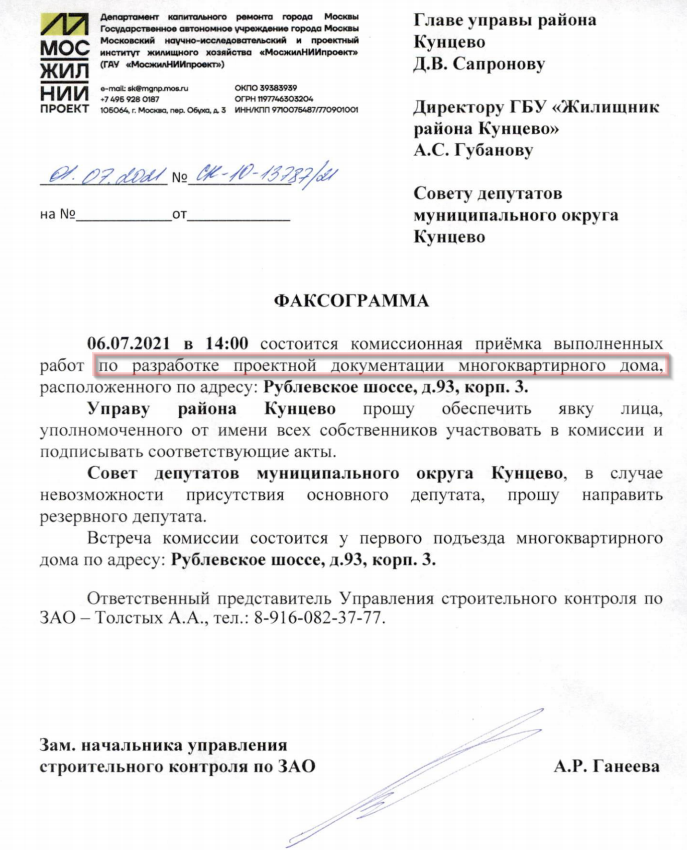 О ремонте системы отопления с нарушениями проектной документации Рублёвское ш., д. 97, к. 3