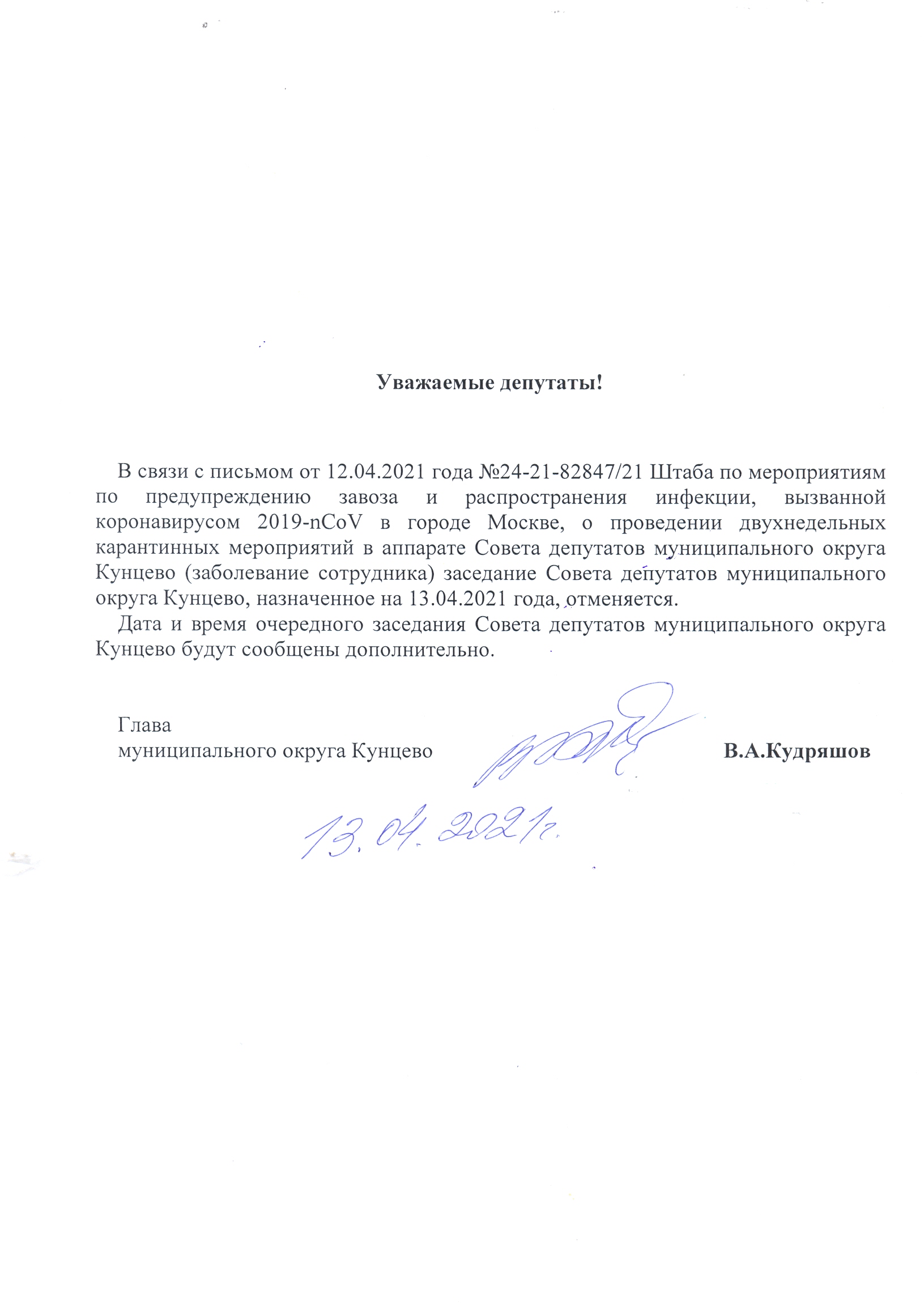очередного заседания Совета депутатов муниципального округа Кунцево