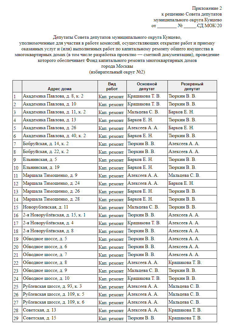1. | Об участии депутатов Совета депутатов муниципального округа Кунцево в работе комиссий по капитальному ремонту общего имущества в многоквартирных домах в 2021 - 2023 годах. Информация депутатов А.А.Алексеева, Д.И.Шендеровича. | 15 мин. |
