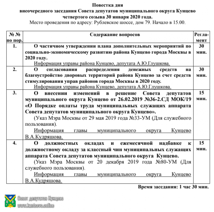 | 1 | О должностных окладах и ежемесячных надбавках к должностному окладу за классный чин муниципальных служащих аппарата Совета депутатов муниципального округа КунцевоИнформация главы муниципального округа Кунцево В.А.Кудряшова. | Проект | 15 минут | Не опубликовано | |