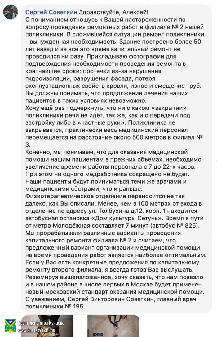 12 ноября 2019 года на заседании Совета депутатов Кунцева в разделе "Разное" состоялось выступление главного врача поликлиники №195 Советкина С.В. о запланированном закрытии с весны 2020 года на капитальный ремонт филиала №2 (ул. Молодогвардейская, д. 40, к.1). Филиал будет полностью закрыт на 2 года.