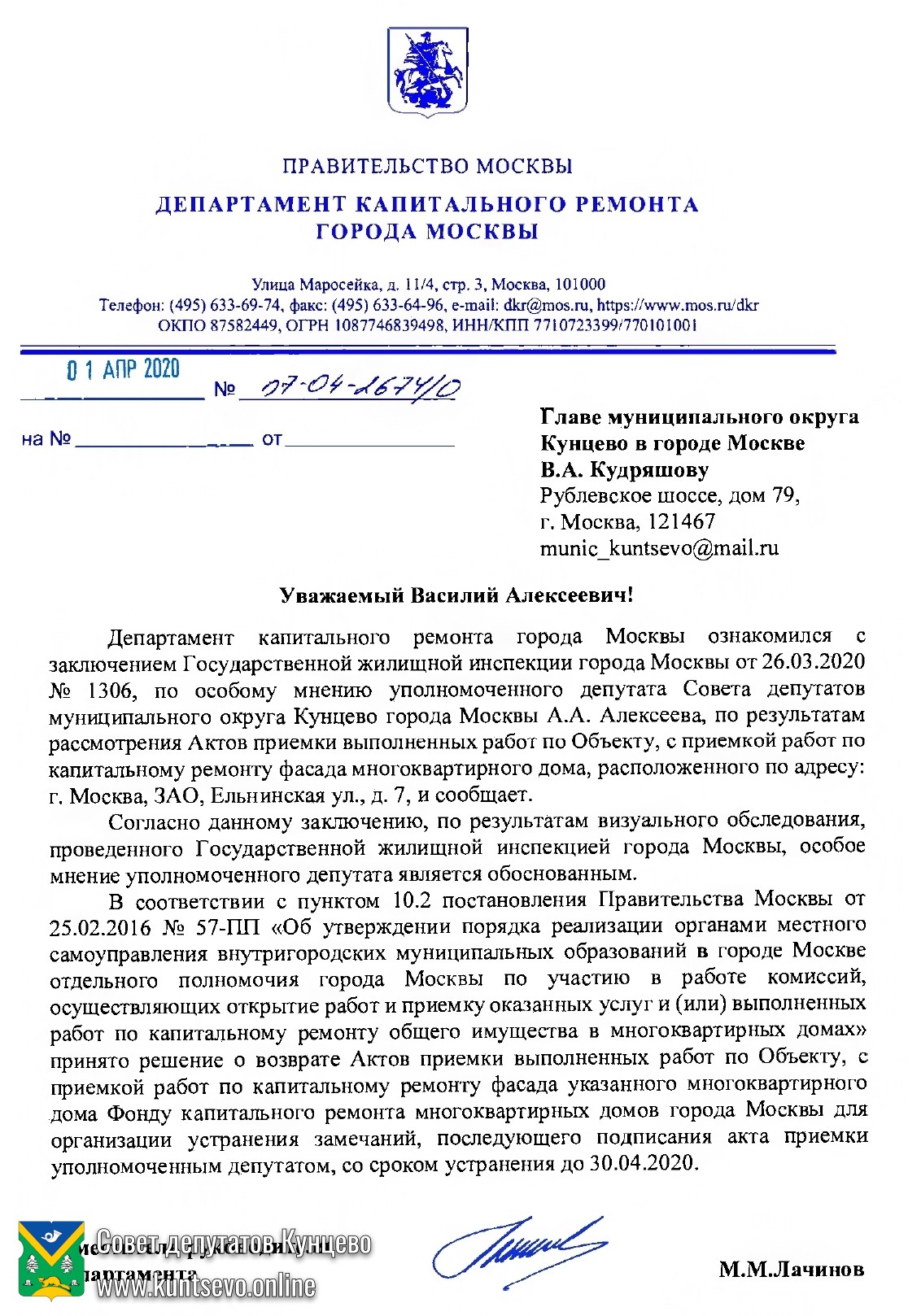 Департамент капремонта г.Москвы признал нарушения при выполнении и приёмке работ по капитальному ремонту дома по адресу: ул.Ельнинская, 7