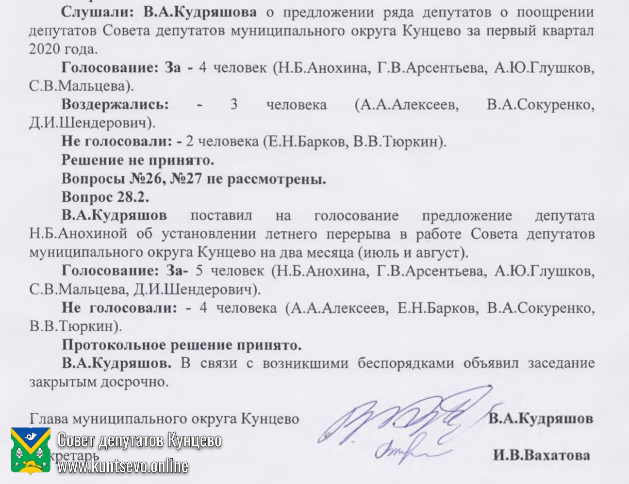 Позднее Кудряшову еще хватило наглости все же состряпать протокол заседания, по которому депутаты, якобы, приняли решение об уходе в 2-х месячный отпуск.
