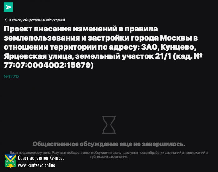 Лично мне, как депутату, пришло несколько сотен обращений жителей против указанного проекта и ни одного в его поддержку. Я не понимаю, кто эти люди, кто нашёл время, чтобы зайти на портал или приложение только ради того, чтобы щелкнуть кнопку "Поддерживаю", за застройку коммерческим проектом в 150 м высотой последней в Кунцево площади.