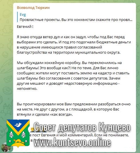 Депутат Всеволод Тюркин попытался донести куда большее количество проблем с этой площадкой. Почти два десятка замечаний. Также пригласил на реальную очную рабочую встречу с реальными депутатами и жителями. Но Евгений Попов заблокировал его, посчитав, что депутаты у него пиарятся перед выборами и ничего не делают.