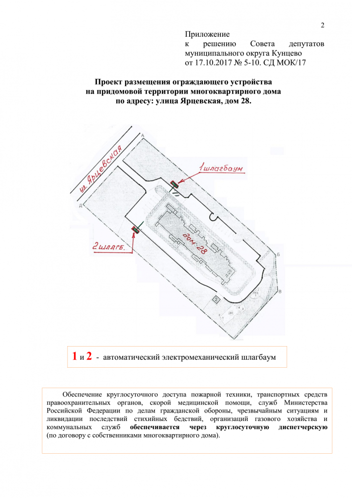 - Согласовать установку ограждающих устройств — двух шлагбаумовдля регулирования въезда и (или) выезда транспортных средств на придомовую территорию по адресу: улица Ярцевская, дом 28 (приложение).