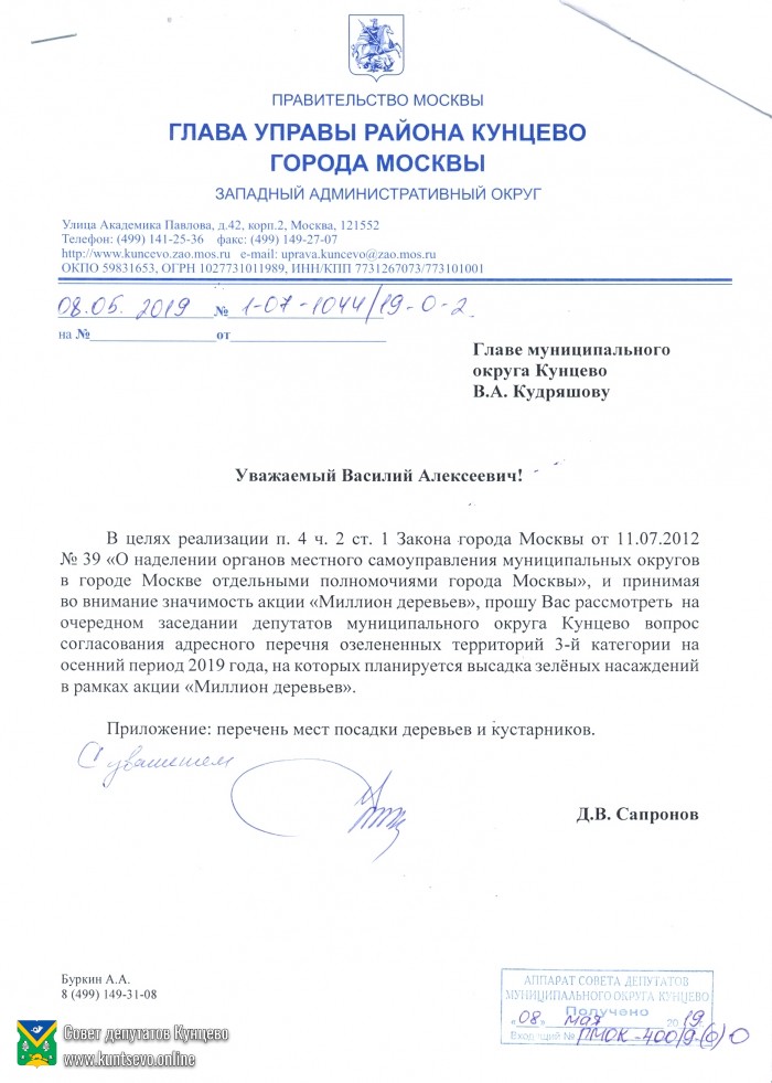 В соответствии с пунктом 4 части 2 статьи 1 Закона города Москвы от 11 июля 2012 года №39 «О наделении органов местного самоуправления муниципальных округов в городе Москве отдельными полномочиями города Москвы», на основании обращения главы управы района Кунцево от 08.05.2019 № 1-07-1044/19-0-2Совет депутатов муниципального округа Кунцево решил: