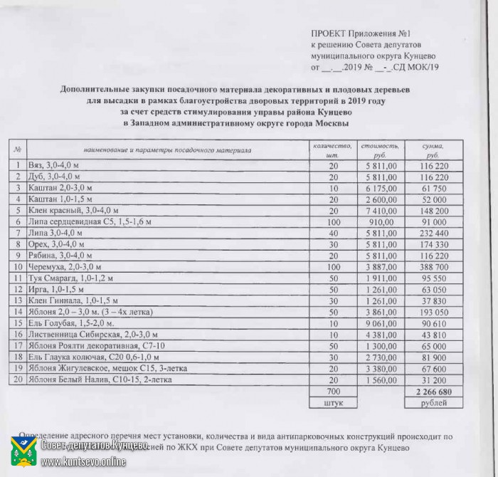 - 1. Согласовать распределение денежных средств на дополнительные закупки посадочного материала декоративных и плодовых деревьев для высадки в рамках благоустройства дворовых территорий района Кунцево в 2019 году за счет средств стимулирования управ районов города Москвы на сумму 2 266 680 (Два миллиона двести шестьдесят шесть тысяч шестьсот восемьдесят) рублей (приложение):